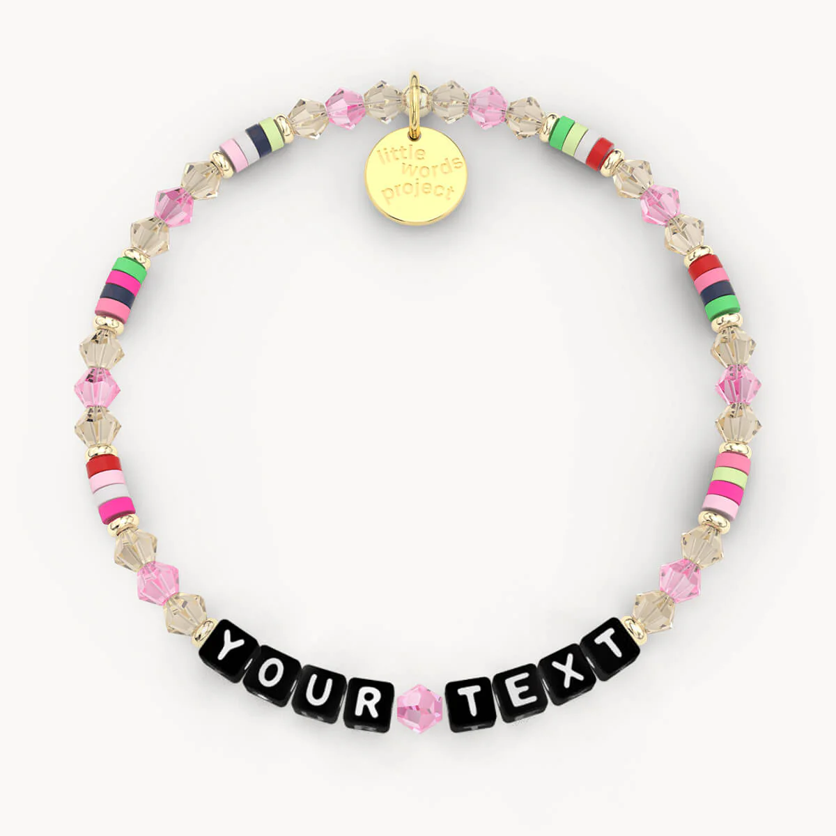 Talk about a party on your wrist! This playful mix of bright beads and sparkling crystals will add a fun pop to any look. Personalize it with your favorite word or phrase, and let the party begin.