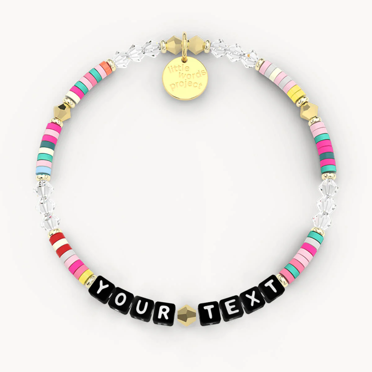 You’ll never forget to live life in full color with this joyful “Rainbow” bracelet. The cheery rainbow beads with gold and crystal accents are the perfect way to make any look stand out. Customize it with a word or phrase that lets your true colors shine.